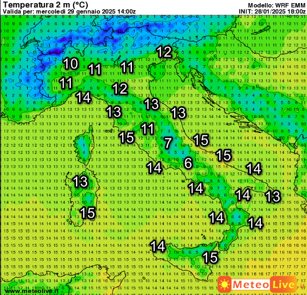 Queste sono le temperature attese in Italia alle ore 15 di mercoledi 29 gennaio: