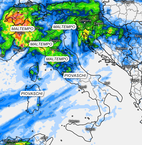MALTEMPO al nord, specie al nord-ovest, con acquazzoni e temporali sparsi, neve oltre i 1700-1900 metri. Rovesci anche sulla Toscana e le aree interne del centro, qualche piovasco anche tra Sardegna e Lazio, per il resto ancora tempo abbastanza soleggiato. Temperature in calo al nord e al centro, stazionarie al sud.