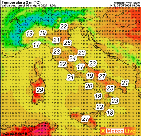 Valori nel complesso gradevoli in Italia, con un po’ di caldo sulle Isole e al sud. Previsti 29° in Sardegna, 27° in Sicilia e sulla Puglia. Valori al di sotto dei 20° sulle pianure del nord-ovest.