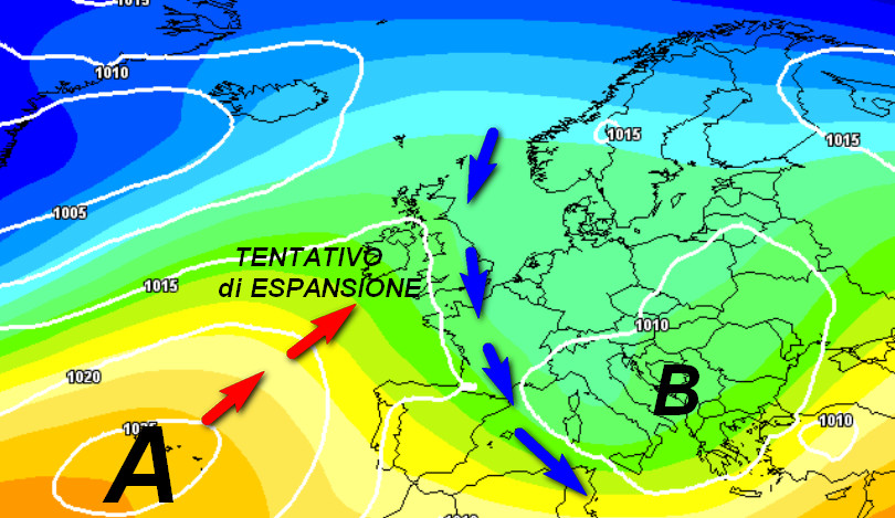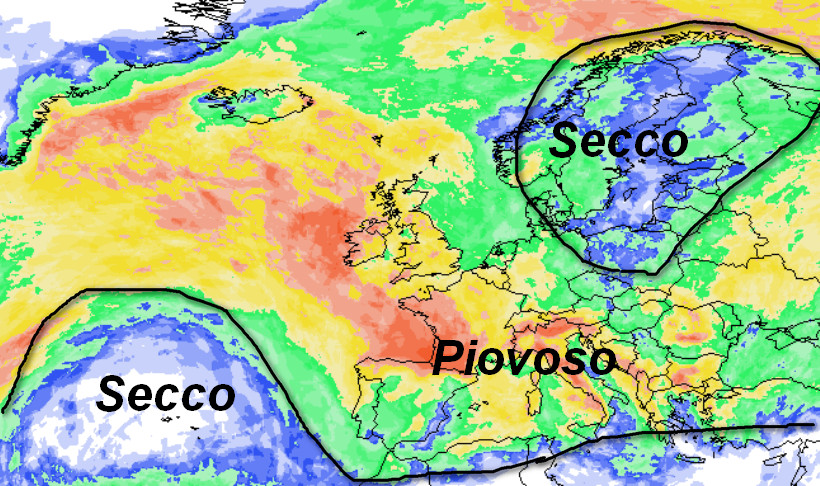 Due zone anticicloniche con clima secco poste ai lati (una sulle Azzorre e l’altra sull’Europa nord orientale), intervallate da un ampio canale piovoso che interesserà gran parte del nostro Continente, compresa l’Italia, dove il tempo si presenterà molto instabile se non del tutto perturbato, in un contesto termico fresco, ma non freddo.