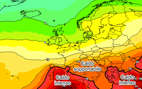Osservando la prima mappa, che illustra le temperature a 1500 metri attese in Europa e sul Mediterraneo nelle ore centrali di sabato 26 luglio, notiamo una situazione confortante per l’Italia.