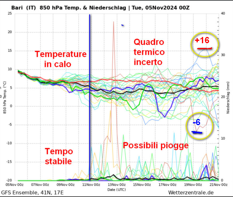 Fino al giorno 11 novembre tempo stabile, ma temperature in lento calo. Possibili piogge a partire dal giorno 12 sotto un quadro termico anche in questo caso molto incerto: lo spread tra i vari cluster delle temperature a 1500 metri risulta compreso tra + 16° e -6°, anche se a lungo termine.