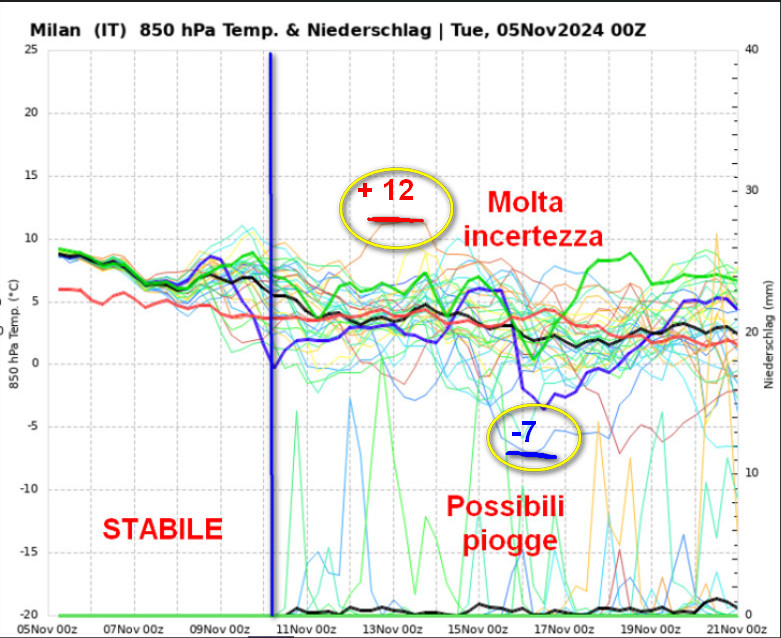 Tempo stabile con nebbie ed inquinamento alle stelle fino al giorno 10 novembre. A seguire si entra in un territorio previsionale molto incerto. Compaiono delle piogge, ma il quadro termico resta tremendamente incerto anche se la possibilità di un calo delle temperature non è remota. Lo spread tra i vari cluster termici (ovvero la differenza di temperatura tra lo spago più freddo e quello più caldo) risulta compreso tra -7° e + 12° a 1500 metri.