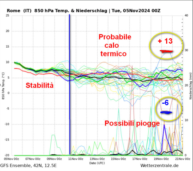 Stabilità quasi indiscussa fino al 10 novembre. A seguire, la maggioranza dei cluster termici punta al ribasso, segno che la probabilità di una fase più fredda risulta abbastanza concreta. Compaiono anche delle piogge specie dopo il giorno 15. Lo spread tra i vari cluster delle temperature è anche in questo caso molto elevato e compreso tra + 13° e -6° a 1500 metri, di conseguenza l’incertezza è ampiamente presente anche sulla Capitale.