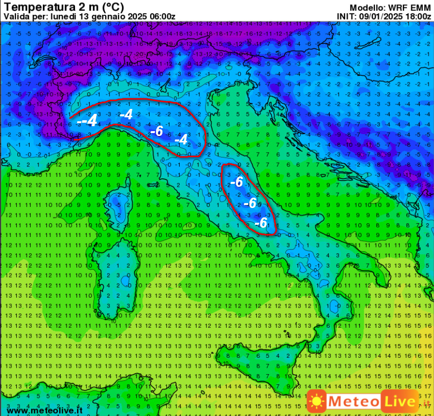 AL SUOLO, il momento più freddo si dovrebbe collocare durante la prima mattinata di lunedi 13 gennaio. Queste sono le temperature attese in Italia alle ore 7 della giornata in parola: