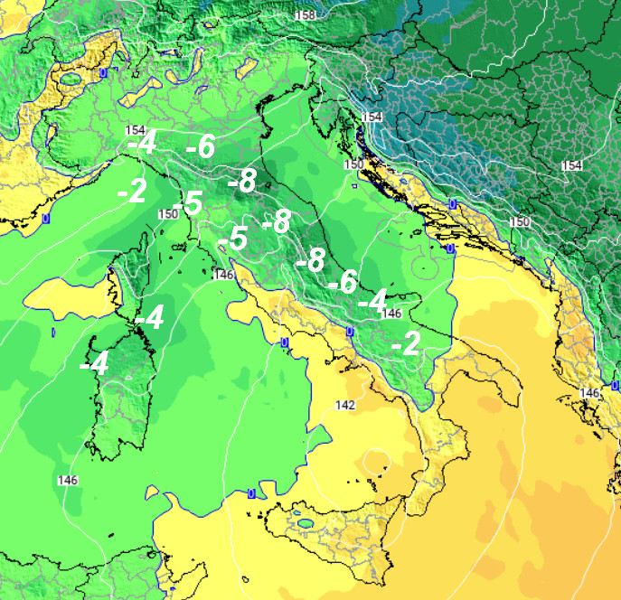 Sulla verticale di Romagna, Marche, Umbria orientale ed Abruzzo settentrionale si prevedono -8° alla medesima quota. Tra -5 e -7° sempre a 1500 metri si prevedono nelle aree interne del centro e -4° sulla Sardegna settentrionale. Al nord si andrà tra i –6° dell’Emilia Romagna ai -2° dell’estremo lembo settentrionale del Piemonte. Al sud tra -4 e -6° tra Molise e Puglia Garganica, -2/-3° sulla Lucania, mentre sulle restanti regioni avremo temperature positive.