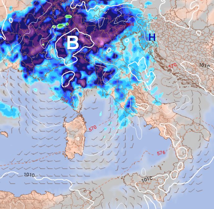 Il problema oltretutto non si esaurirà con l’episodio temporalesco di domenica, ma si protrarrà al nord ad intermittenza anche nei giorni successivi, con temporali anche serali e notturni, perché non transiterà l’asse di saccatura e il vento non ruoterà praticamente mai a nord-ovest, ma la circolazione rimarrà condizionata dal Libeccio, che favorirà precipitazioni molto abbondanti lungo la fascia pedemontana e prealpina.
