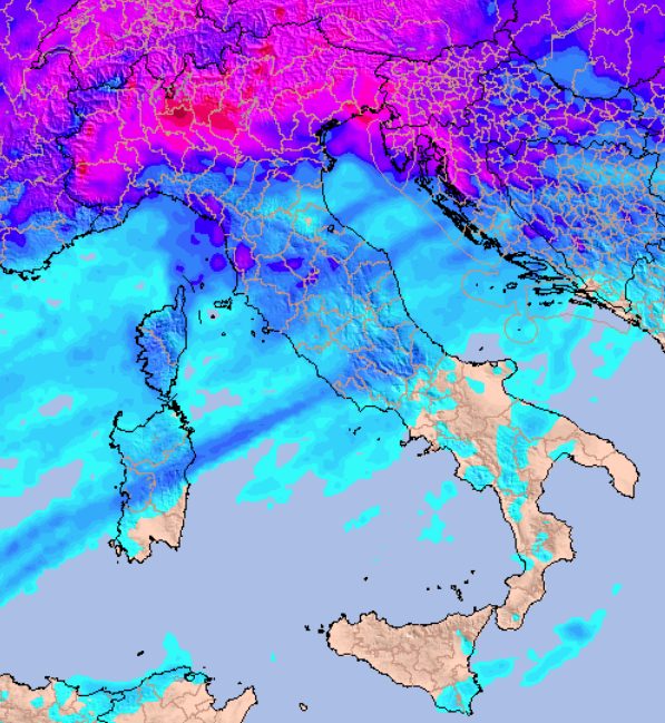 Ed ecco la sommatoria dei fenomeni sino a metà mese che certifica quanto appena esposto, frequenti temporali al nord, qualche rovescio qua e là anche al centro, il nulla al sud; la colorazione fucsia indica accumuli nell’ordine dei 75-100mm, dunque in leggero calo rispetto ai valori semi-alluvionali previsti nelle scorse 24 ore, ma sempre rilevanti: