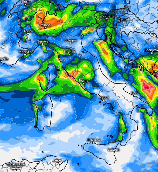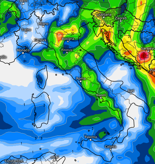 Ecco le conseguenze a livello precipitativo sempre con lo stesso modello di riferimento e con depressione al suolo in azione soprattutto tra regioni tirreniche, Emilia-Romagna, Veneto e Friuli Venezia Giulia: