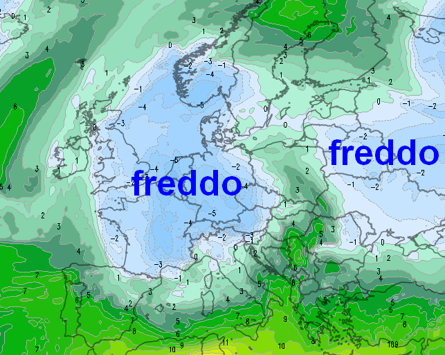 L’irruzione fredda quasi invernale però viene ormai vista da molti modelli (tranne UKMO) e recherà comunque un disturbo notevole all’anticiclone, costretto a ritirarsi verso nord. Le conseguenze successive saranno ovviamente tutte da verificare, ma intanto l’autunno farà un passo avanti verso l’inverno, ecco una carta termica del modello GFS prevista per il 14 novembre a 1500m: