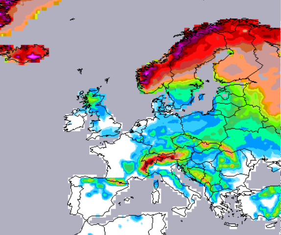 Vediamo allora una stima della copertura nevosa sino alla Vigilia di Natale sull’Europa proposta dal modello GFS, che mette in evidenza che questi passaggi ci saranno, anche se colpiranno soprattutto il centro Europa e i versanti esteri delle Alpi, ma con qualche riflesso anche in Italia (lo si nota dagli accumuli nevosi previsti lungo la dorsale appenninica):