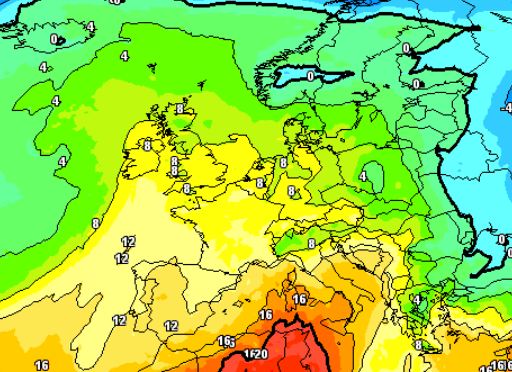 La cosa è ancora più evidente se si prende la mappa termica a 1500m, dove si nota che il caldo evidenziato nelle scorse emissioni, in realtà si ridurrà alle isole maggiori, mentre al nord farà addirittura fresco con quel rientro di correnti orientali.