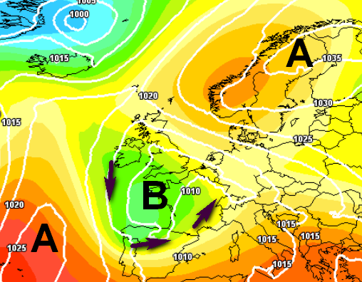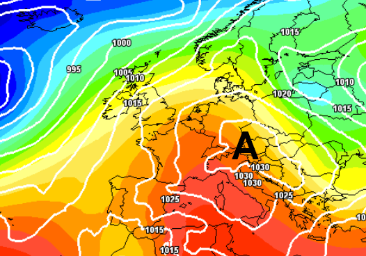 Vediamo allora la breve performance dell’anticiclone, noteremo che i suoi massimi al suolo di 1030hPa saranno raggiunti solo a causa dell’ingresso di aria più fredda da est sul settentrione, come testimonia quella sorta di “naso” coricato sulla Valpadana visibile dalle isobare (linee bianche che congiungono i punti con uguale pressione):