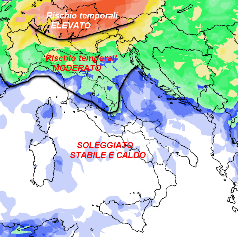 Alpi, Prealpi e soprattutto il Triveneto si confermano le aree con le maggiori possibilità di assistere a temporali, che localmente potrebbero anche raggiungere una certa intensità. Un moderato rischio di temporali sarà presente anche sul resto del settentrione e su limitati settori delle aree interne centrali. Su tutte le altre regioni, invece, prevarrà un tempo stabile e anche decisamente caldo.
