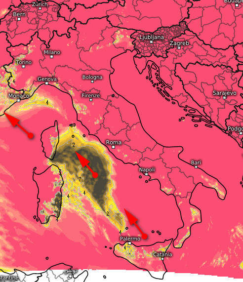 Facciamo ora un passo indietro. Questo è il soleggiamento totale cumulato previsto tra le 9 e le 16 di giovedi 20 marzo (rosa molto soleggiato, giallo nubi e schiarite, grigio scuro assenza di sole):