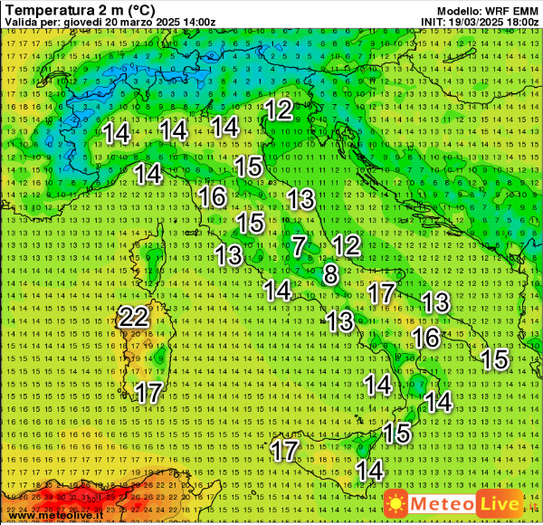 Dal punto di vista termico, queste sono le temperature attese in Italia alle ore 15 di giovedi 20 marzo: