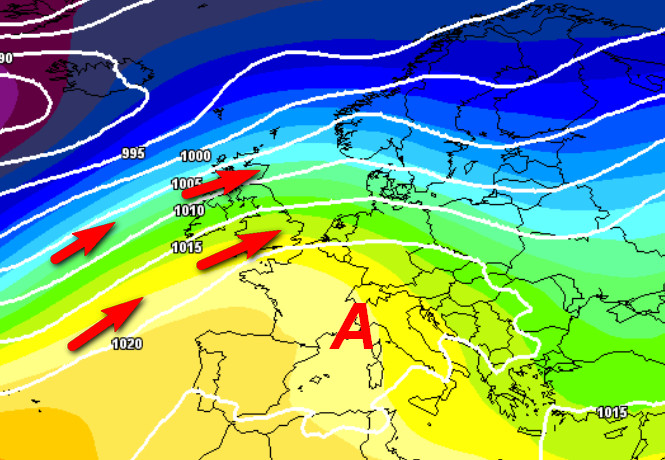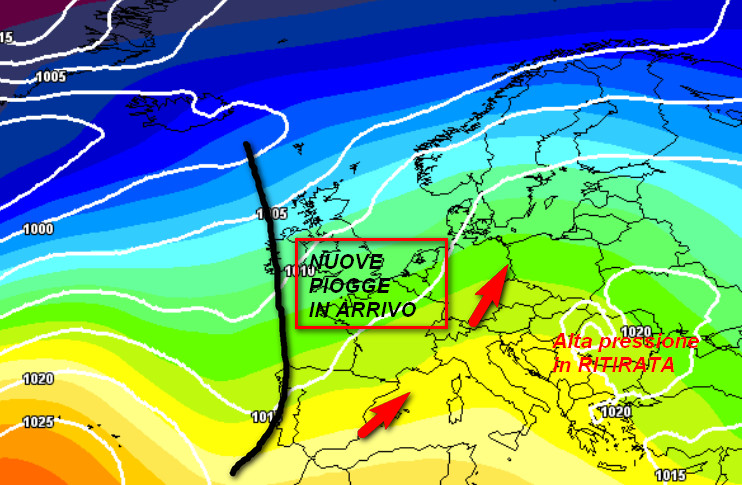 Alta pressione in ritirata ad opera di una nuova perturbazione che porrà una saccatura abbastanza vasta sull’Europa occidentale, preceduta da correnti miti da sud-ovest.