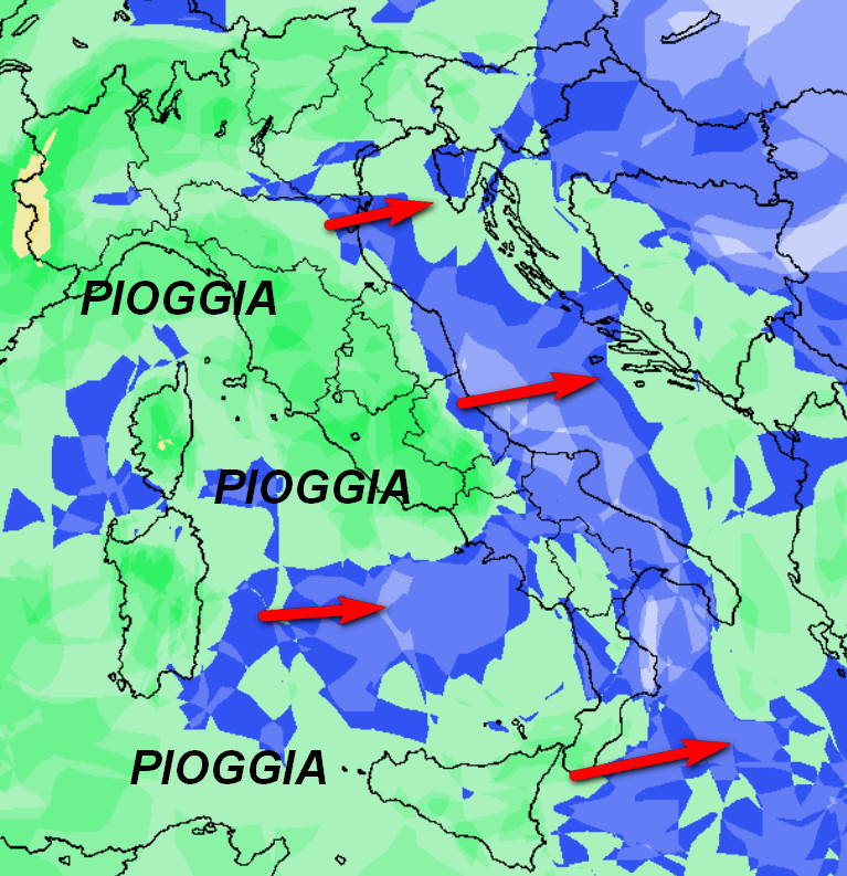 Probabilità di pioggia in aumento sull’Italia a partire da ovest, in accordo con la nuova perturbazione in ingresso sul nostro Paese in un contesto abbastanza mite e umido.