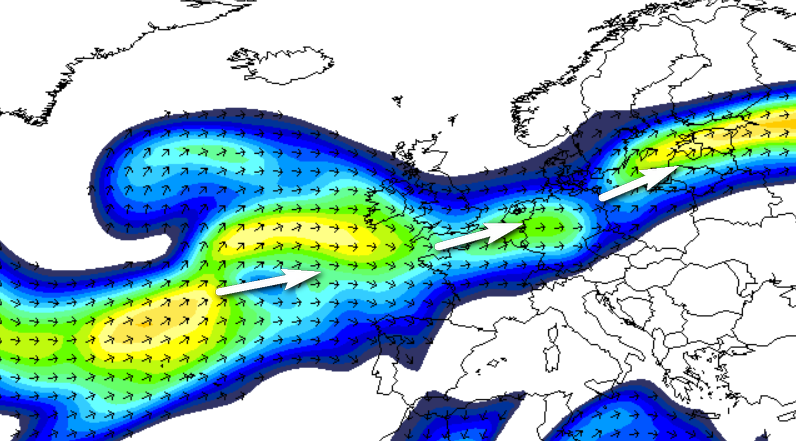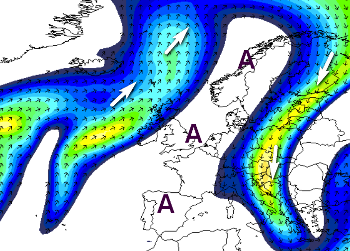 Sembra che le cose possano andare in tal senso anche quest’anno: guardate in blu la distensione della corrente a getto prevista dal modello GFS per Capodanno, comanderebbero le correnti da ovest con lo schema descritto sopra: