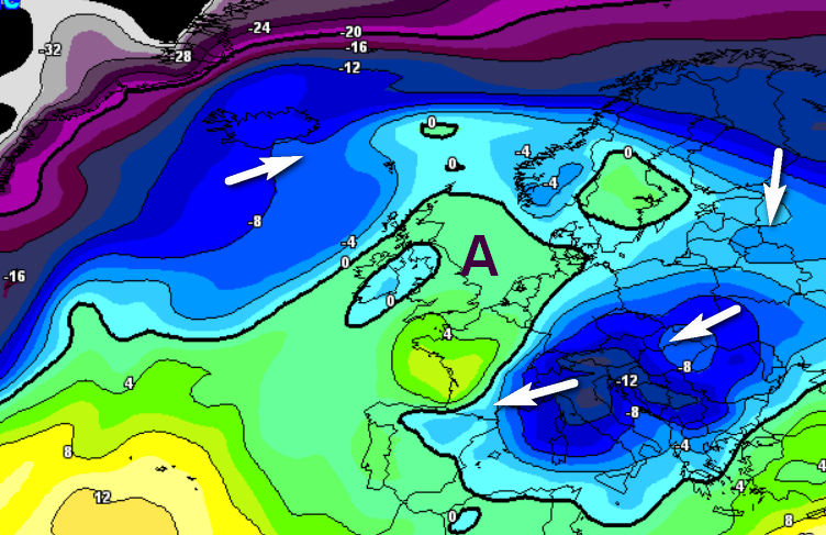 Verso l’Epifania invece potrebbe esservi una temporanea frenata con conseguente ondulazione della corrente a getto e afflusso di aria più fredda da NNE sulle regioni adriatiche e meridionali, come si vede nella mappa successiva, con annesso calo termico, qualche precipitazione passeggera, anche nevosa lungo la dorsale appenninica del medio Adriatico e del meridione, con vento sostenuto, nessun cambiamento di rilievo sul resto del Paese: