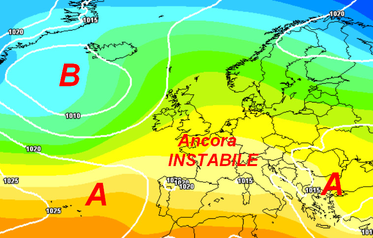 Alte pressioni ai margini dell’Italia, mentre le grandi depressioni dovrebbero ritirarsi tra l’Islanda ed il Regno Unito. Sull’Europa centrale e sull’Italia avremo quindi una situazione ibrida che ospiterà condizioni di instabilità segnatamente nel pomeriggio e nelle aree interne e montuose, in un contesto termico complessivamente mite.