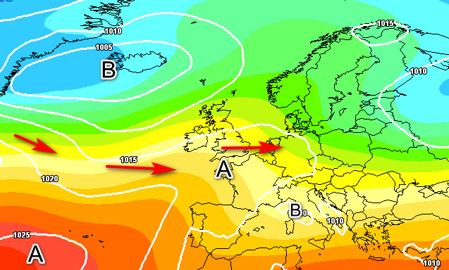 Pur rappresentando un quadro meteorologico tutt’altro che stabile, dalla mappa di cui sopra si nota come le configurazioni bariche tendano a posizionarsi in assetti più tradizionali per l’inizio dell’estate. In altre parole, le zone depressionarie saliranno di latitudine, mentre le alte pressioni occuperanno lidi più meridionali.