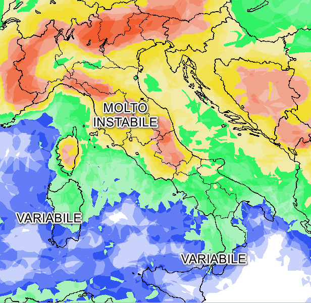 Notiamo gran parte della Penisola ancora alle prese con una probabilità di pioggia MEDIO-ALTA o addirittura ELEVATA dove vedete il colore rosso; di conseguenza avremo elevate condizioni di instabilità segnatamente al nord e nelle aree interne dell’Italia centrale, mentre sulle Isole e all’estremo sud andranno in scena condizioni meteo variabili, con probabilità di pioggia più BASSA.
