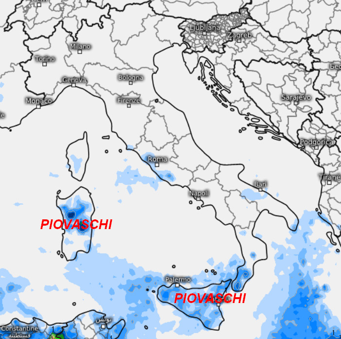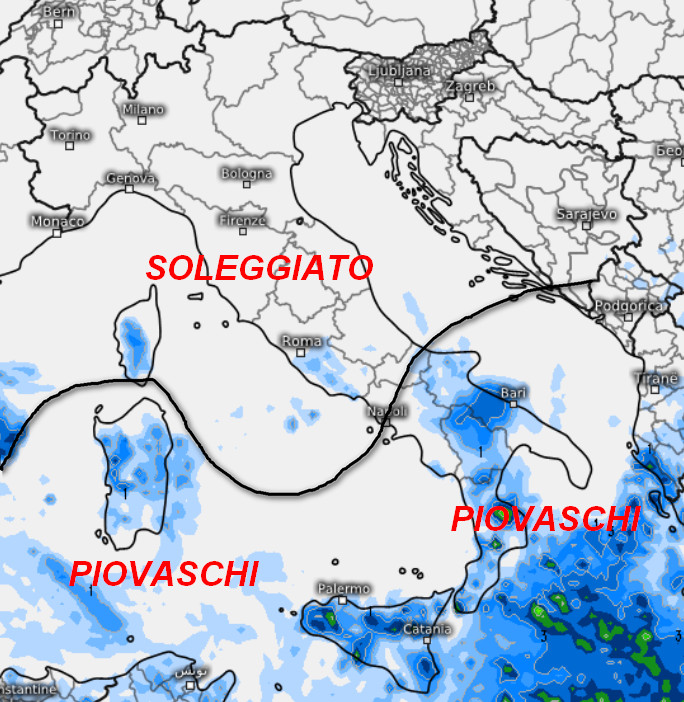 Tempo soleggiato e mite di giorno al nord e sul centro peninsulare. Piovaschi saranno invece possibili sulle Isole e al sud, segnatamente sulla Sicilia, Calabria e Lucania. Si tratterà di piogge brevi e locali che non daranno luogo ad accumuli importanti.