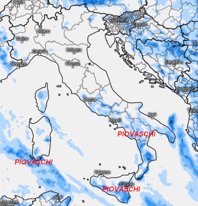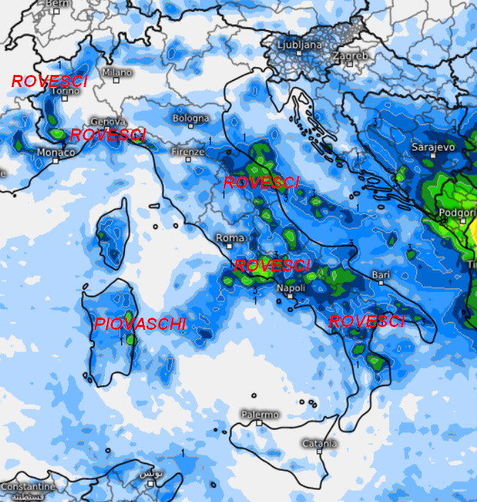 Brevi rovesci saranno probabili nell’arco della giornata sulle regioni centrali, segnatamente lungo il versante adriatico e sul basso Lazio. Rovesci anche su Puglia, Lucania, Calabria e sulla Sardegna, ma generalmente non associati ad accumuli importanti. Qualche breve piovasco anche al settentrione, specie su Emilia Romagna e sulle Prealpi.