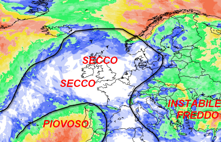 Sulla destra dell’immagine notiamo l’aria fredda in allontanamento dall’Italia, che sarà temporaneamente invasa da un lembo del grande anticiclone con centro sulle Isole Britanniche. Ad ovest dell’Iberia notiamo invece una circolazione ciclonica che inizierà a mettere umide e miti correnti di Scirocco sul Mediterraneo occidentale.
