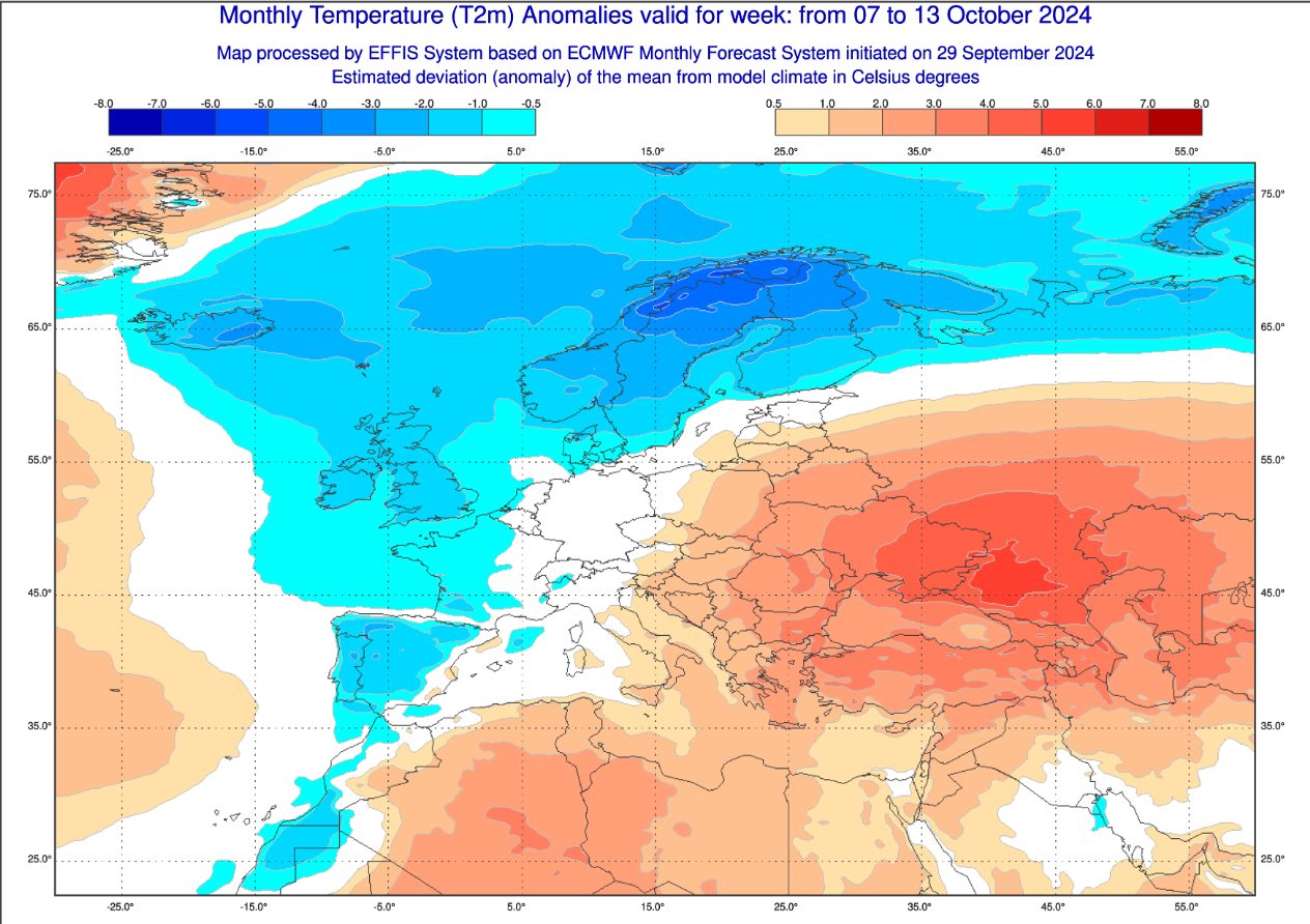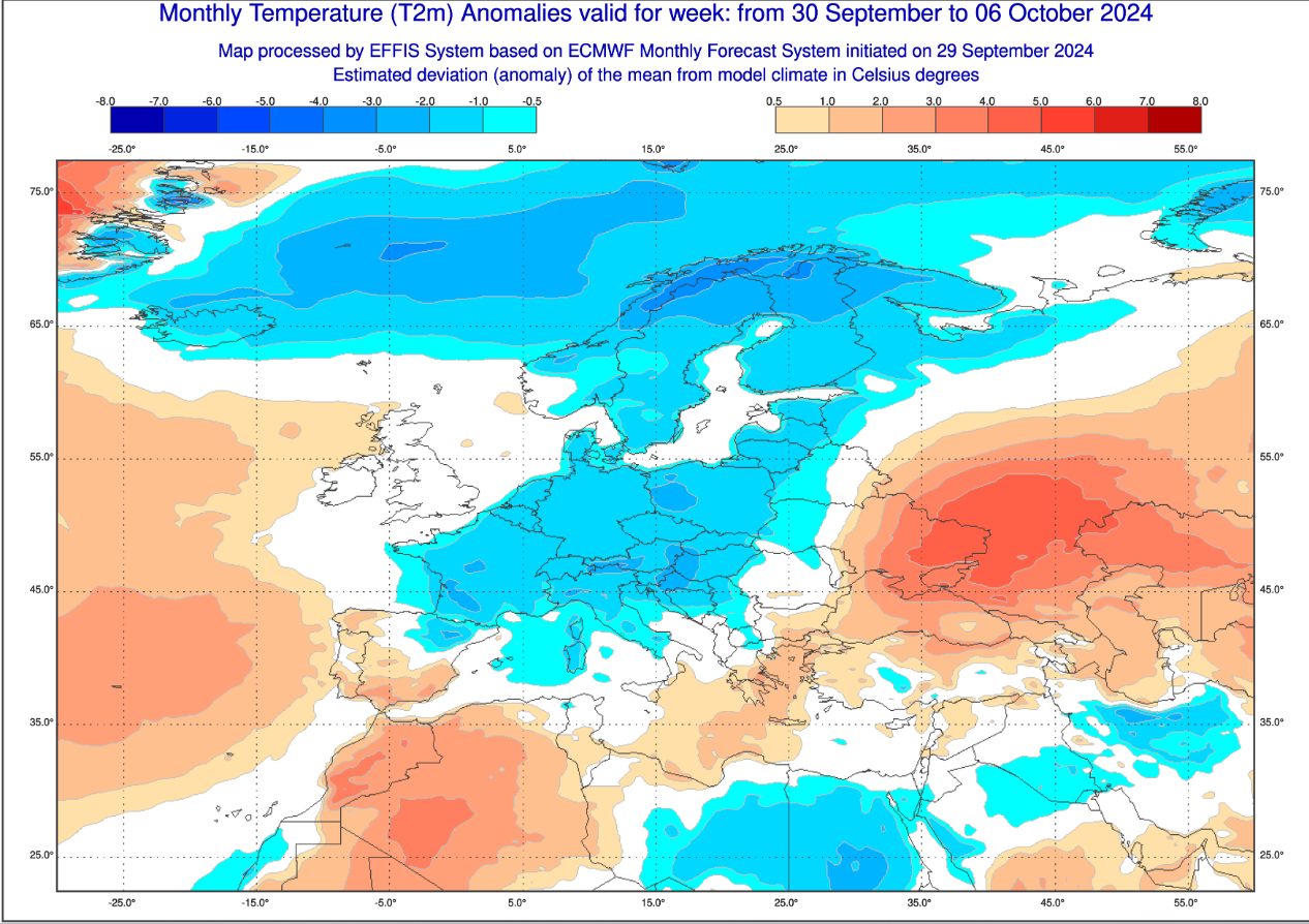 La prima mappa mostra le anomalie termiche attese in Europa nel lasso temporale compreso tra oggi (lunedi 30 settembre) e il 6 ottobre: