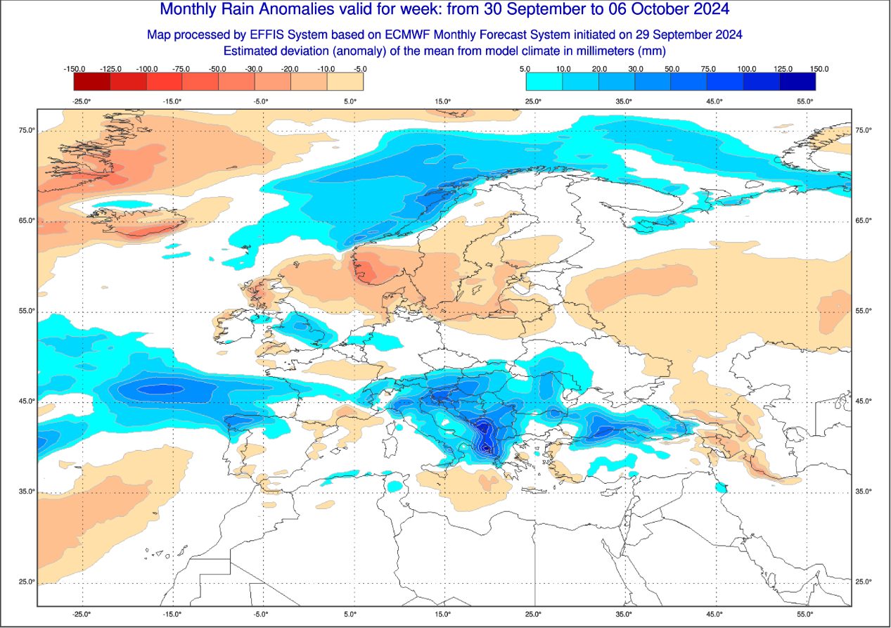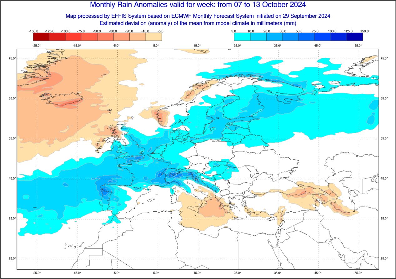 Infine, le anomalie precipitative attese in Europa nel medesimo lasso temporale: