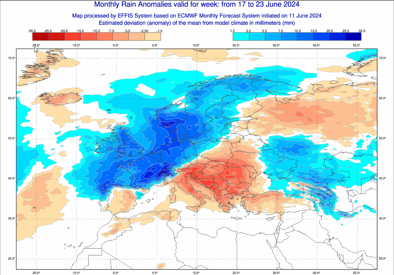 Osserviamo adesso la mappa delle ANOMALIE PRECIPITATIVE previste per il lasso temporale compreso tra il 17 e il 23 giugno: