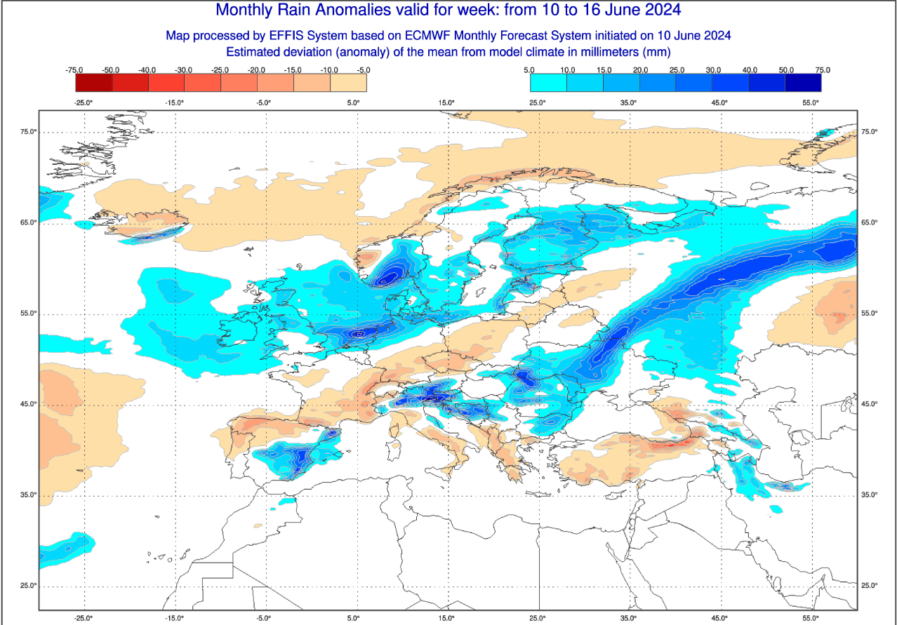 Fa impressione il surplus piovoso atteso praticamente su tutti i Paesi dell’Europa centrale e settentrionale dove avremo fenomeni temporaleschi anche intensi. Questo surplus di pioggia sfiorerà anche l’arco alpino dove avremo intense situazioni temporalesche specie sulla parte centrale ed occidentale della chiostra montuosa. Sul resto d’Italia (praticamente tutta) avremo invece un periodo fortemente deficitario sul fronte delle piogge, specie al centro e al sud.