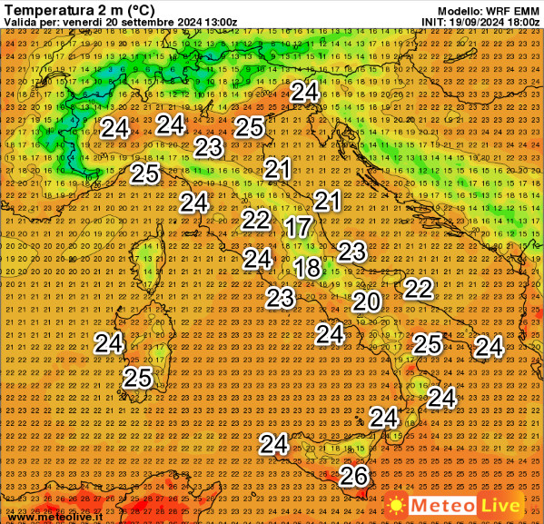 Valori termici in generale ripresa. Un po’ fresco nelle aree interne del centro e del meridione. Punte di 26° in Sicilia e 25° su Liguria, Sardegna, coste venete e Lucania.