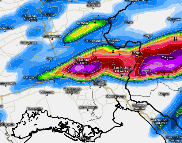 Secondo questo LAM ad area limitata ci potrebbero essere temporali tra Nogaredo, San Michele del Carso e Gorizia.