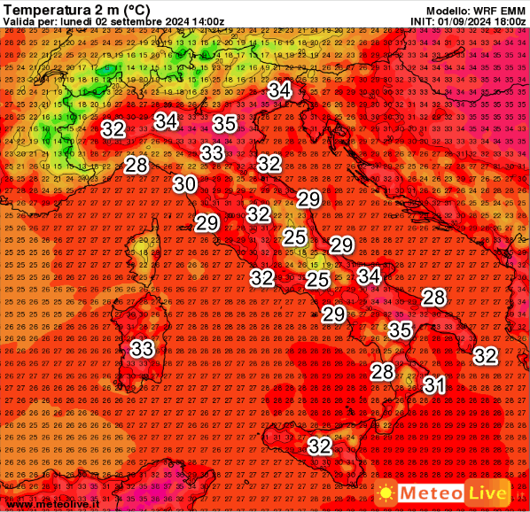 I valori accenneranno un calo laddove avremo i rovesci ed i temporali. Si prevedono però ancora punte di 35° sulla Valpadana orientale e sulla Lucania. Questo è L’INDICE di DISAGIO da CALDO atteso in Italia nella giornata odierna e nei prossimi giorni.