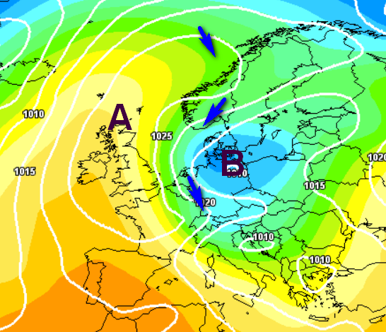 Sul finire dell’anno invece e durante la prima decade di gennaio si manifesterebbe una frenata della corrente a getto con conseguente discesa di aria fredda diretta dalla Scandinavia verso il Mediterraneo e peggioramento di tipo invernale sull’Italia, come si nota qui: