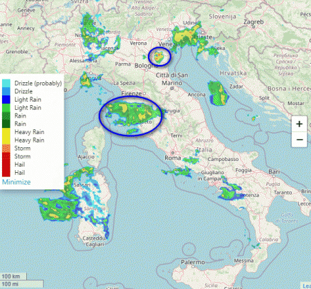 Altri nuclei temporaleschi sono presenti sul Golfo Ligure, al nord-est, in prossimità della Sardegna e sulla Campania. Piogge invece deboli o moderate sono in atto sulla Lombardia.