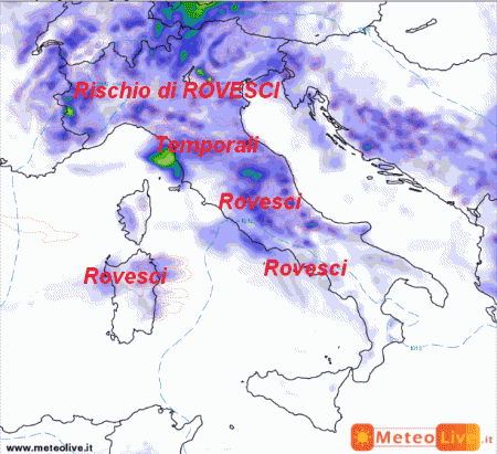La situazione non cambierà rispetto agli ultimi giorni. Come vedete, tutto il nord, le regioni centrali e parte del meridione saranno sotto rovesci e temporali più o meno intensi. Si salveranno solo le estreme regioni meridionali e la Sicilia dove le piogge saranno scarse se non del tutto nulle.