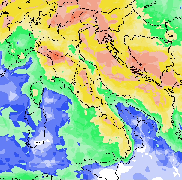 Infatti, se analizziamo la mappa della probabilità di precipitazioni in Italia per la medesima giornata (venerdi 13 settembre) notiamo quando segue. Vi ricordiamo che: In blu probabilità di pioggia bassa (sotto al 25%), in verde medio-bassa (fra 25 e 50%), in giallo medio-alta (fra 50 e 75%) e in rosso alta o molto alta” (oltre il 75%).