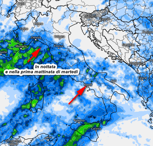 La prima perturbazione, più debole, inizierà ad agire sul settori di ponente da questa sera. Ecco la sommatoria delle precipitazioni attese in Italia fino alle 7 di domani mattina, martedi 26 marzo:
