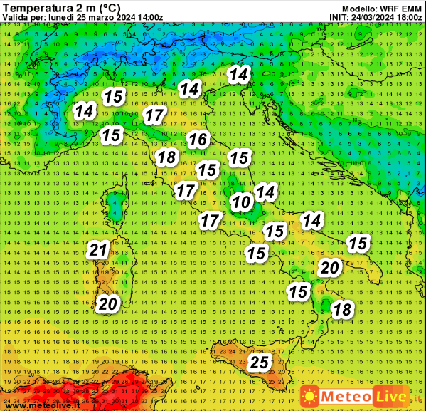 Valori davvero esuberanti solo in Sicilia dove si toccheranno i 25° nei settori interni. Su tutte le altre regioni temperature miti, leggermente più fresche, come già accennato, sui settori del nord.