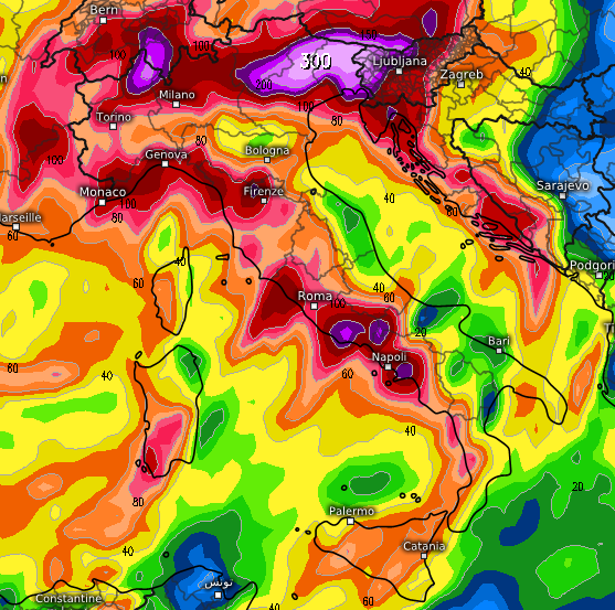 Quanta pioggia è prevista complessivamente? Secondo le proiezioni, potrebbero cadere fino a 300 mm o più di pioggia in alcune aree, in particolare sul Cadore e il Friuli Venezia Giulia.