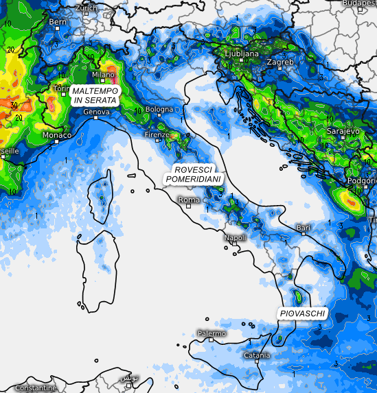Tempo in peggioramento nell’arco della giornata su Piemonte, Val d’Aosta, Lombardia e Triveneto con rovesci e temporali; ancora assenti le precipitazioni sulle restanti aree del nord. Temporali pomeridiani nelle aree interne del centro e qualche piovasco al sud al mattino, in via di attenuazione.