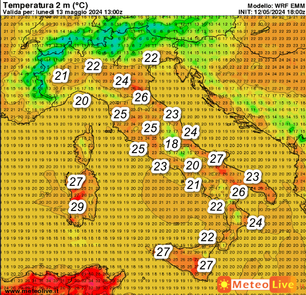 Valori nel complesso gradevoli in Italia. Segnaliamo comunque 29° in Sardegna e 27° su Sicilia e Puglia.