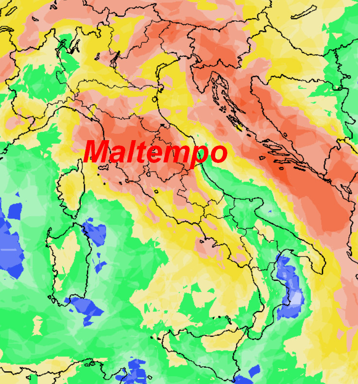 Sull’Italia prevarranno condizioni di tempo perturbato, con ELEVATA probabilità di pioggia specie nelle aree contrassegnate con il colore arancione o rosso sulla mappa. Saranno davvero poche le aree con una BASSA probabilità di pioggia, dove vedete il colore blu. Sulle Alpi cadrà ovviamente la neve ad altezze da valutare, ma difficilmente a quote basse.
