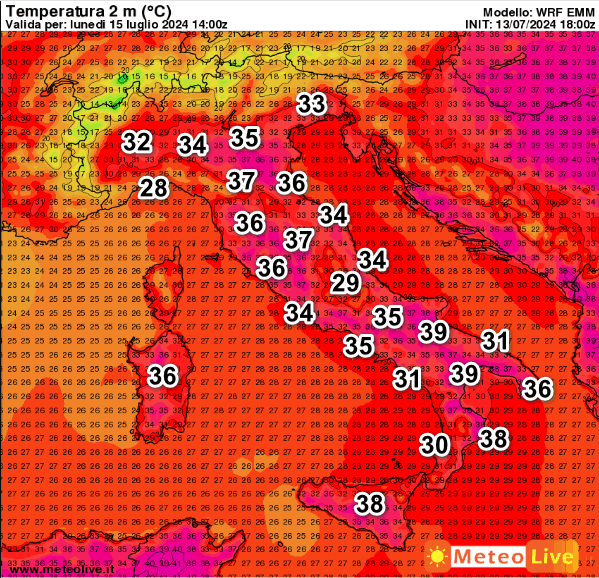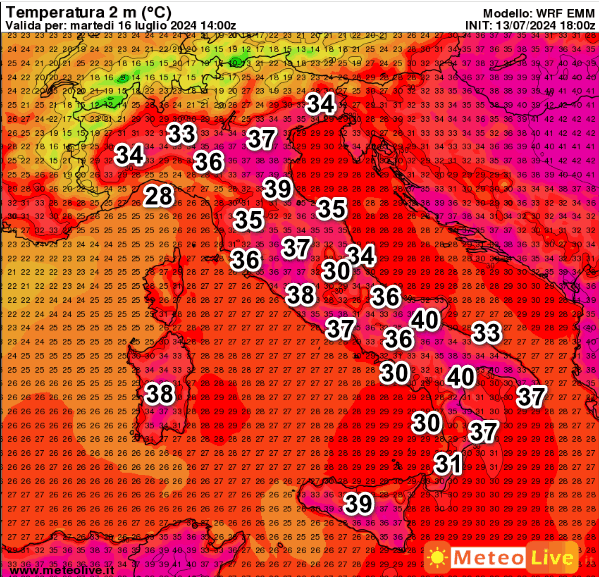 Ritroviamo puntuali i 40° sul Foggiano ed in Lucania, 39° nelle zone interne della Sicilia e sulla pianura romagnola, 38° in Sardegna e nel Lazio, con molti settori italiani alle prese con valori oltre i 35°. Massima attenzione anche al DISAGIO da CALDO che si farà sentire praticamente su tutte le nostre regioni.