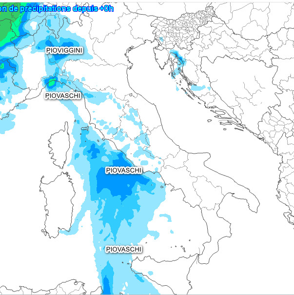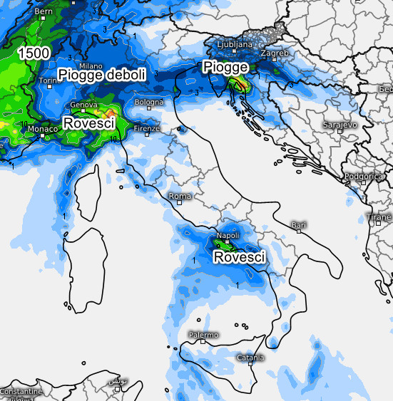 Al nord rovesci sulla Liguria, neve sulle Alpi centro-occidentali oltre i 1500-1600 metri, piogge deboli sulle pianure del nord. Rovesci anche sulla Campania e qualche piovasco su alcune aree del Tirreno, per il resto tempo asciutto. Freddo al nord, molto mite altrove.