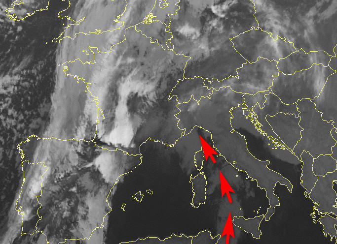 La blanda zona di alta pressione che si è insediata sul Mediterraneo risulta subito insidiata da una saccatura abbastanza blanda che si sta avvicinando all’Italia da ovest. Sta già determinando un richiamo di correnti umide meridionali che portano piovaschi sulla Liguria e su alcune aree del Tirreno.